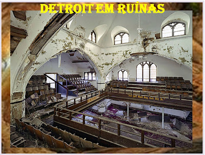 Chegando à cidade os fotógrafos encontraram uma paisagem de abandono e decadência no centro de Detroit, algo que começou na década de 50. Acima, uma igreja metodista abandonada.
